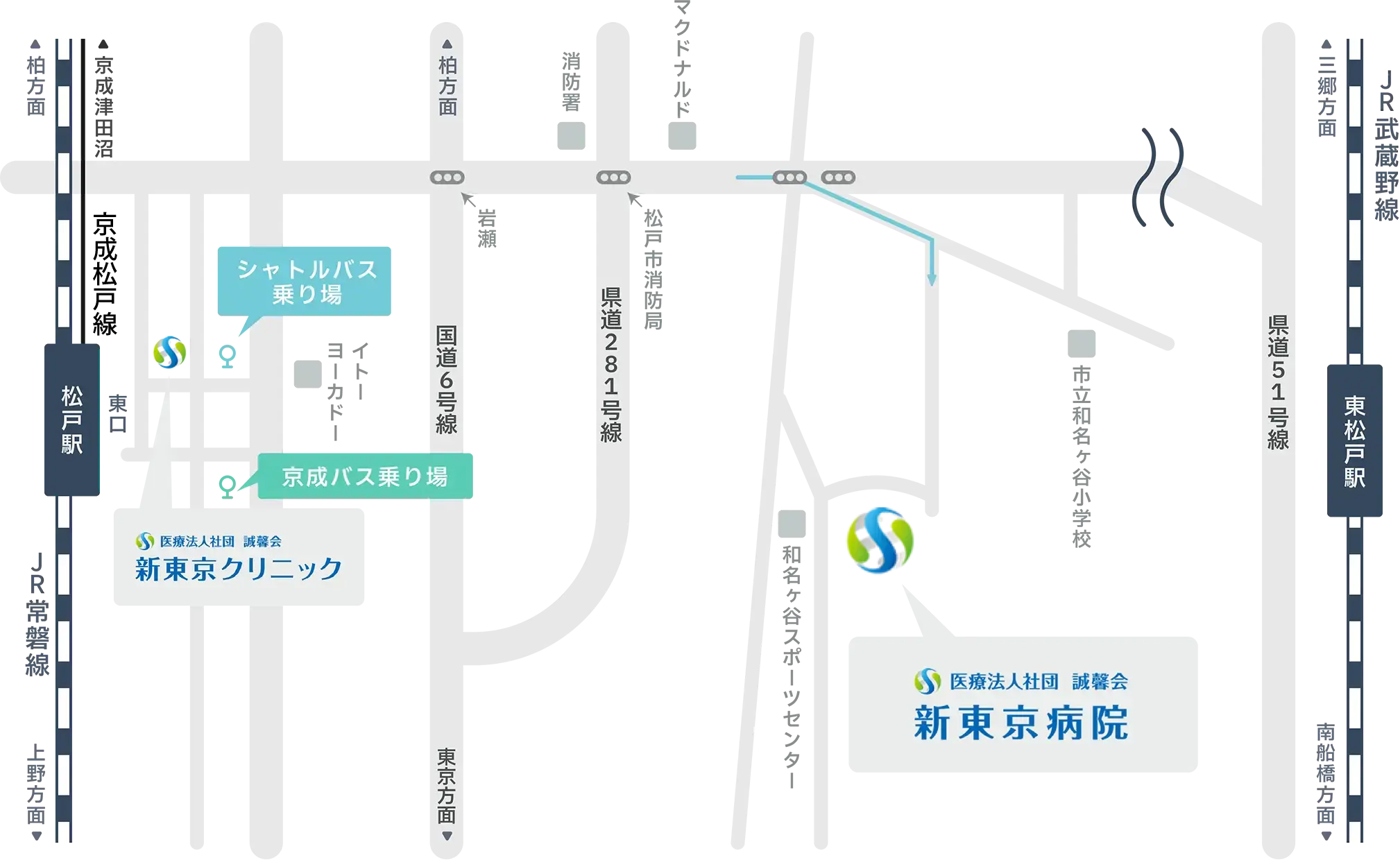 ※ 松戸駅(新東京クリニック)〜新東京病院間のシャトルバスを運行しております。